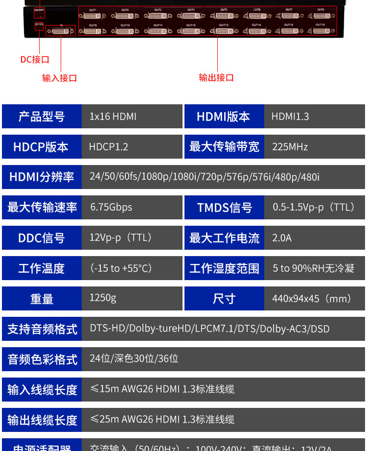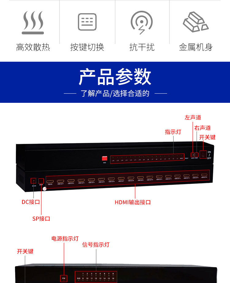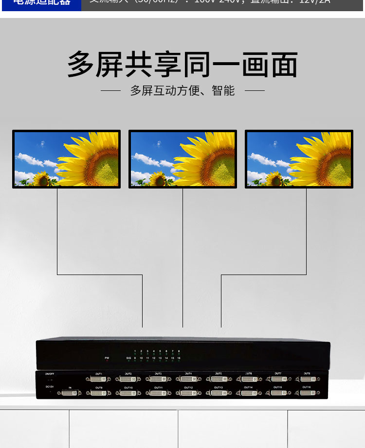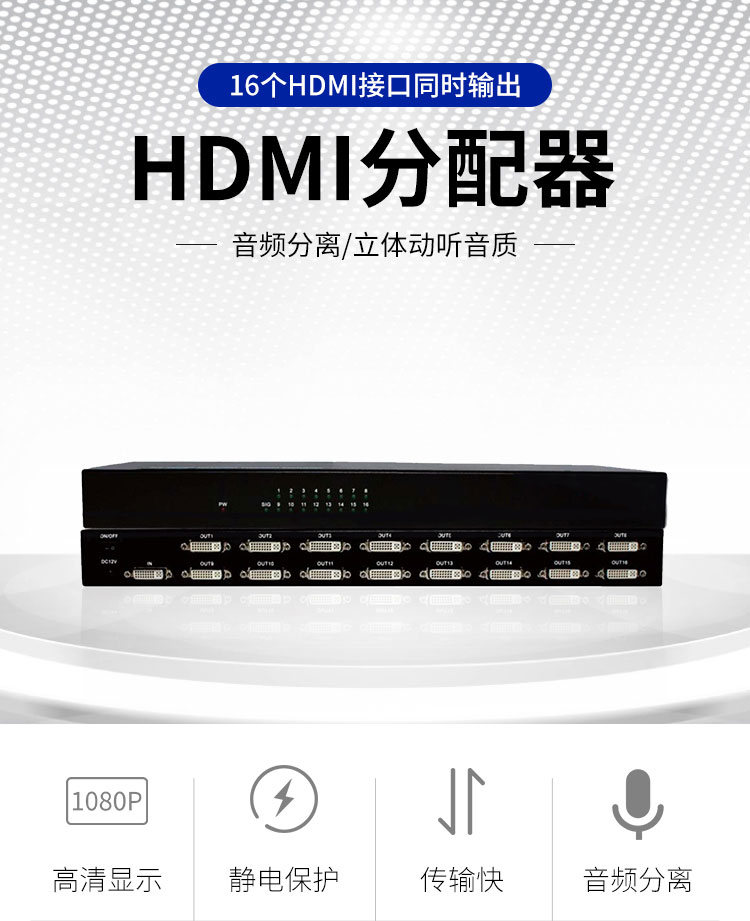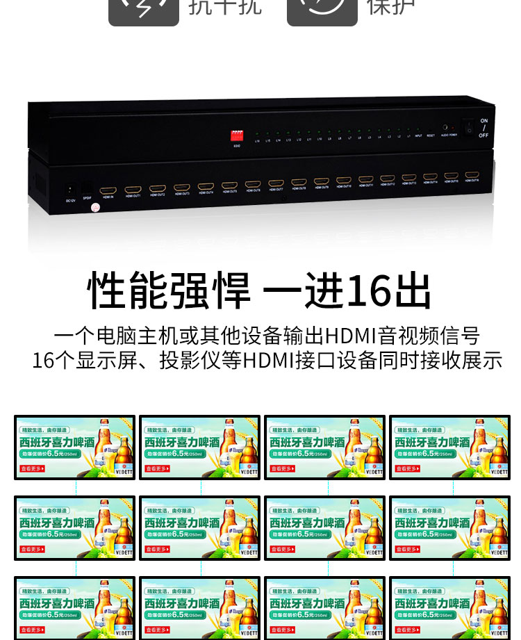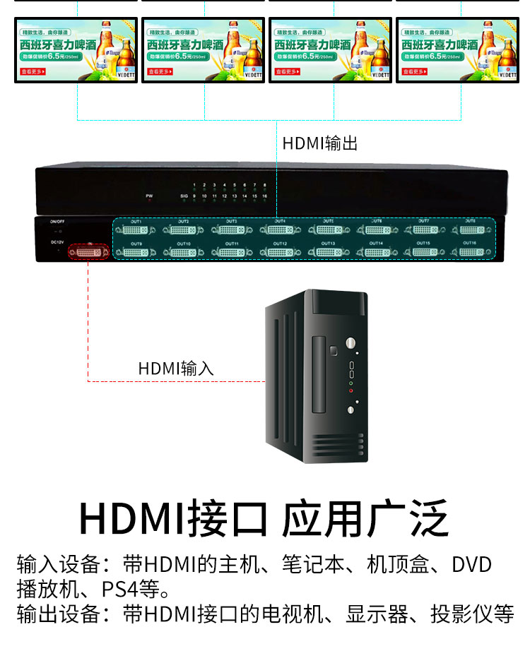 一個(gè)電腦主機(jī)或其他設(shè)備輸出 HDMI 音視頻信號(hào),16 個(gè)顯示屏、投影儀等 HDMI 接口設(shè)備同時(shí)接收展示。