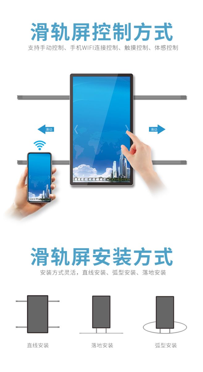 在滑軌屏的滑動(dòng)線路上的不同位置設(shè)置感應(yīng)點(diǎn),不同感應(yīng)點(diǎn)可設(shè)置不同播放內(nèi)容。