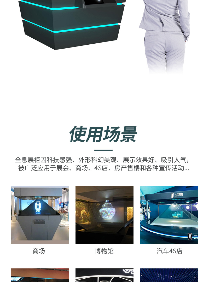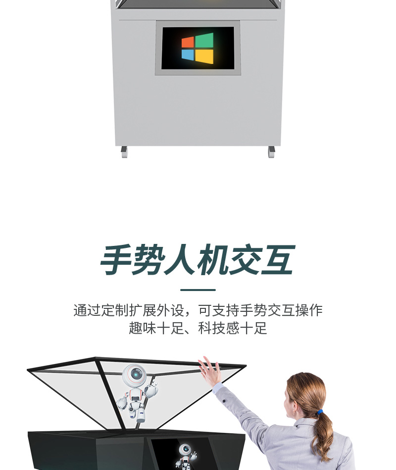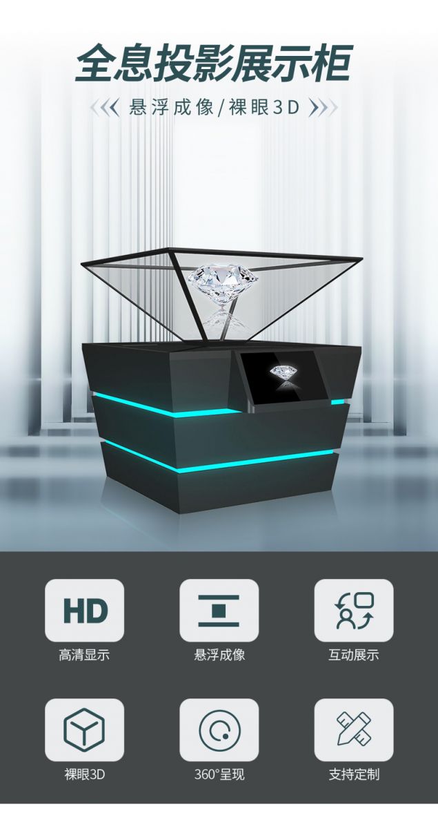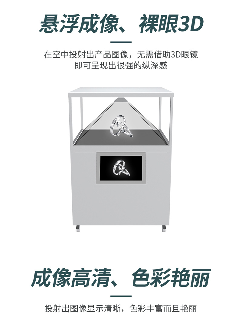虛幻與現(xiàn)實的結(jié)合,裸眼就可以盡情觀看奇妙的 3D 立體幻影效果,柜體時尚美觀,有科技感;空間成像色彩鮮艷,對比度,清晰度高;具有空間感,透視感。
