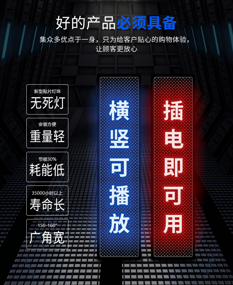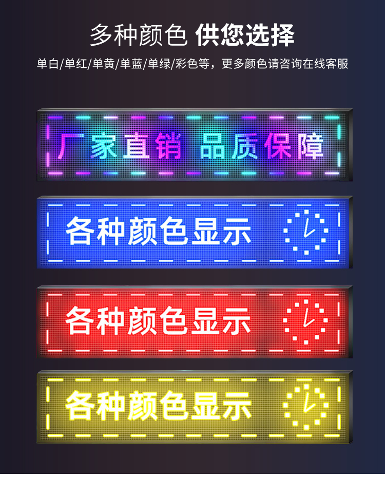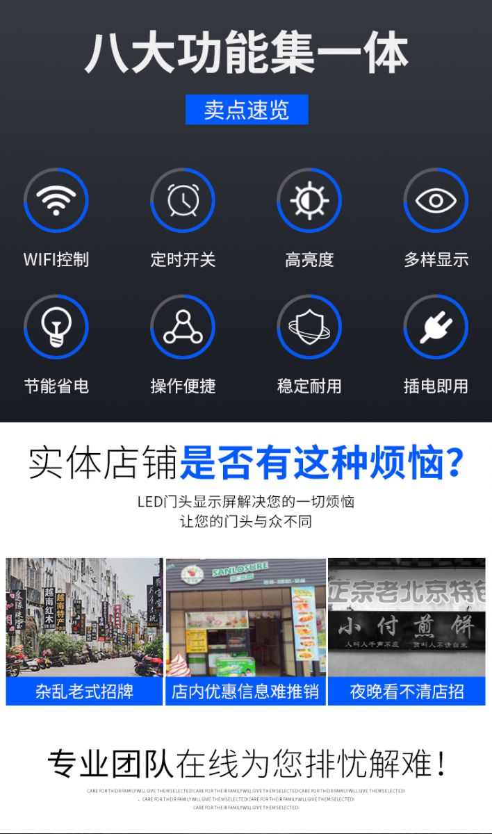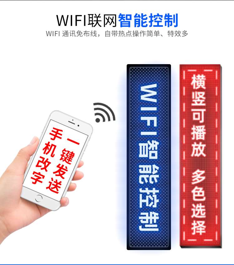 防水防曬,多彩高亮,節(jié)能省電,手機(jī)一鍵控制改字改色,內(nèi)置 WIFI,插電即用,定時開關(guān),多樣顯示。