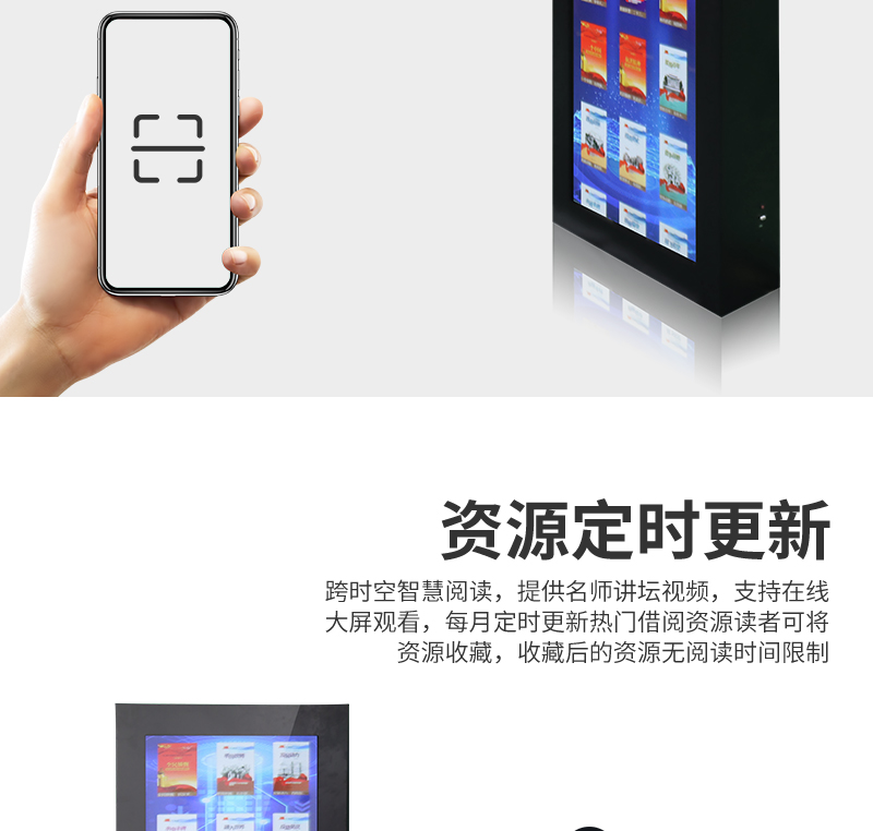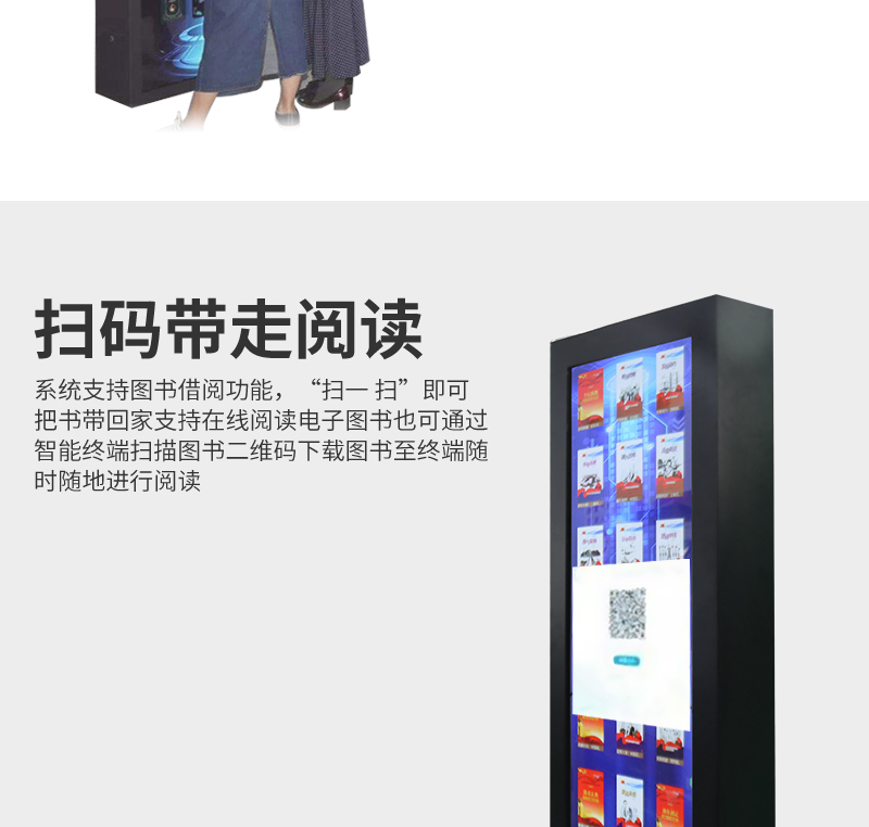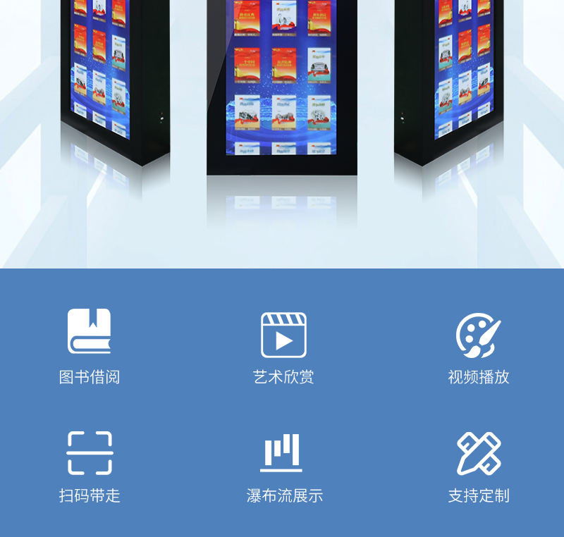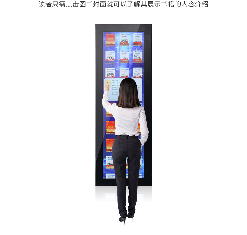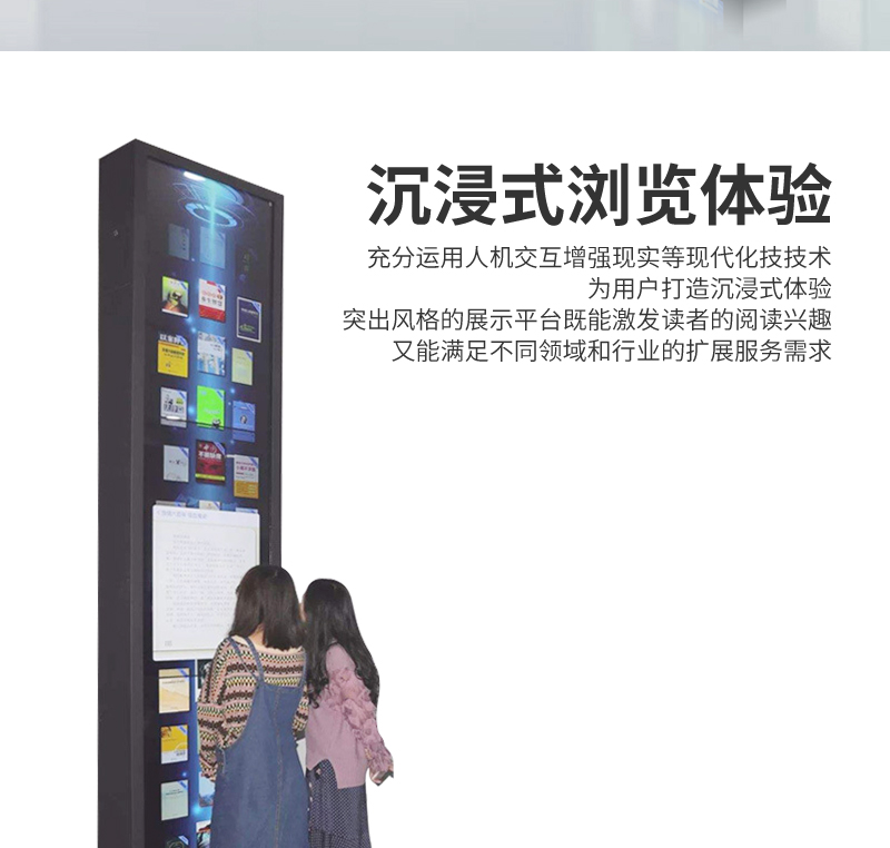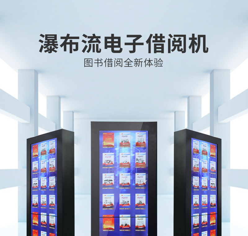 森克瀑布流拼接屏借還書一體機展示大量電子書籍,讀者只需點擊圖書封面就可以了解其展示書籍的內(nèi)容介紹,享受沉浸式瀏覽體驗。