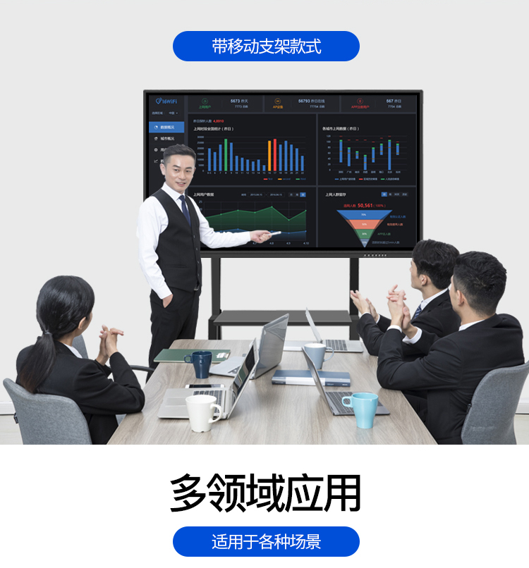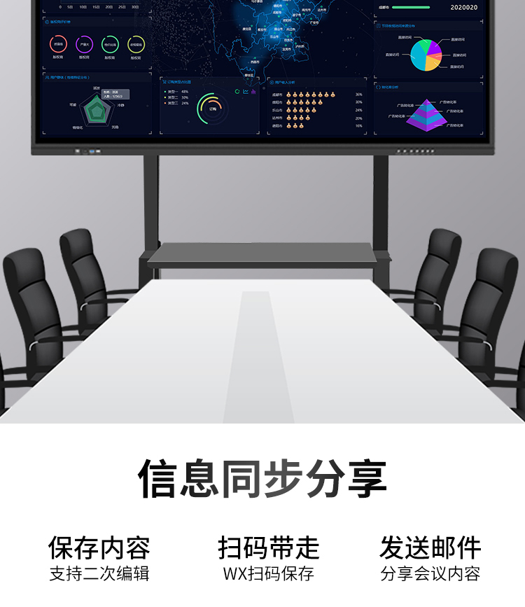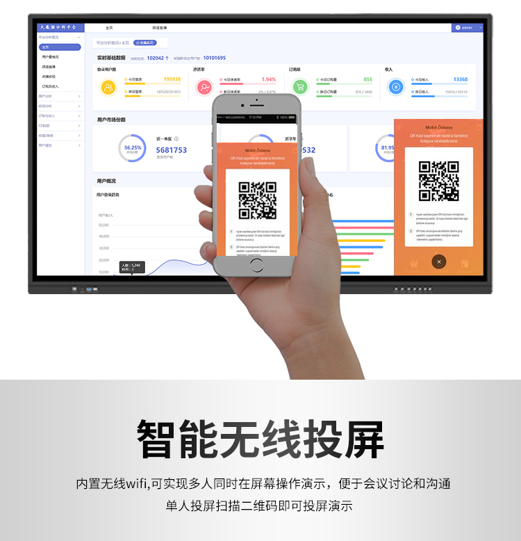【產(chǎn)品簡介】智能無線投屏,內(nèi)置無線 wifi, 可實現(xiàn)多人同時在屏幕操作演示,便于會議討論和溝通,單人投屏掃描二維碼即可投屏演示。