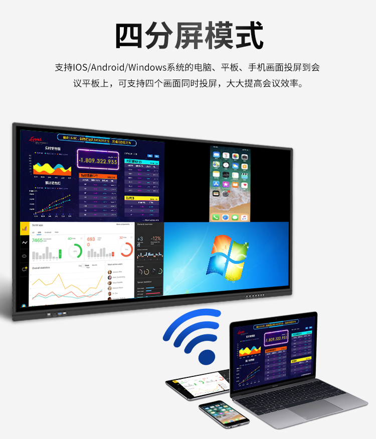 【無線投屏】內(nèi)置無線 WIFI,可實現(xiàn)多人同時在屏幕操作演示,便于會議討論和溝通,單人投屏掃描二維碼即可投屏演示。